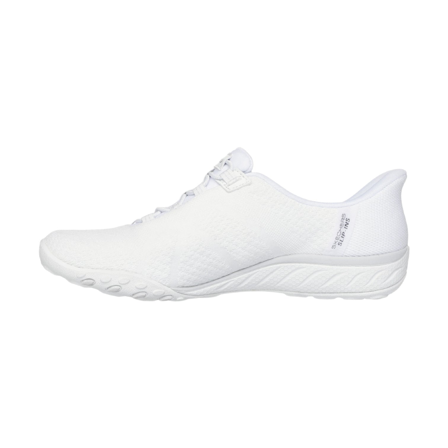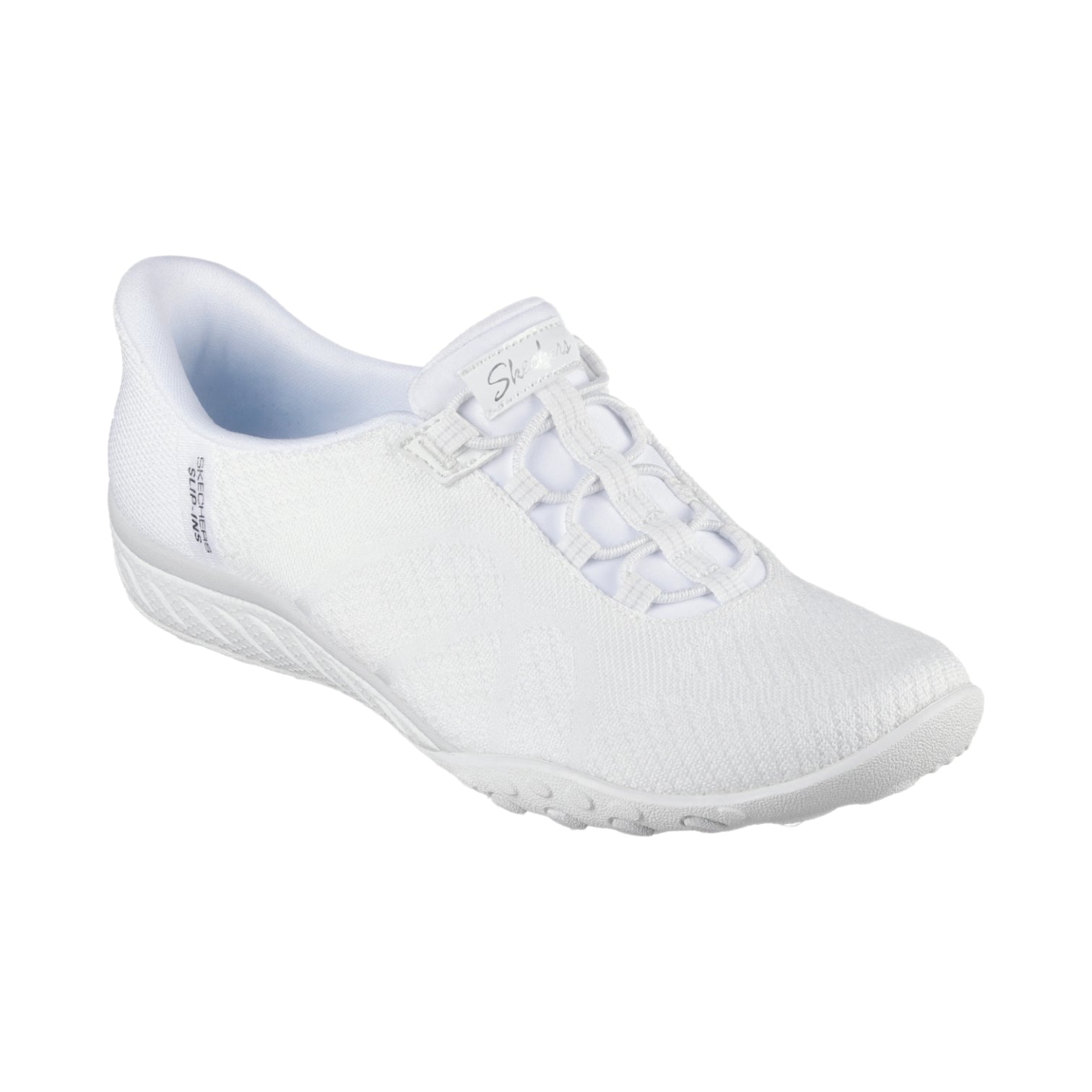 simply slip into comfort and style with skechers hands free slip-ins®: breathe-easy - knitty waves. this sleek shoe is designed with our special heel pillow™ and has an engineered knit stretch fit® upper with fixed stretch laces. it also features a cushioned skechers air-cooled memory foam® insole for a comfortable feel all day.